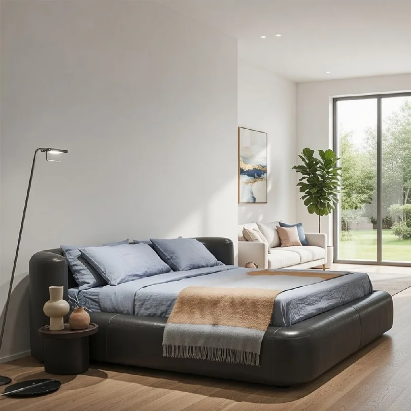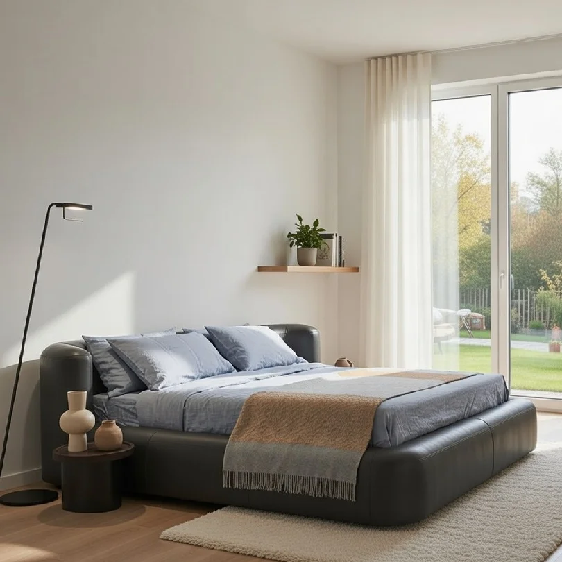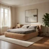 With its balanced proportions and smooth upholstery finish, the bed presents a refined appearance from every perspective, making it a stylish focal point in any bedroom layout.