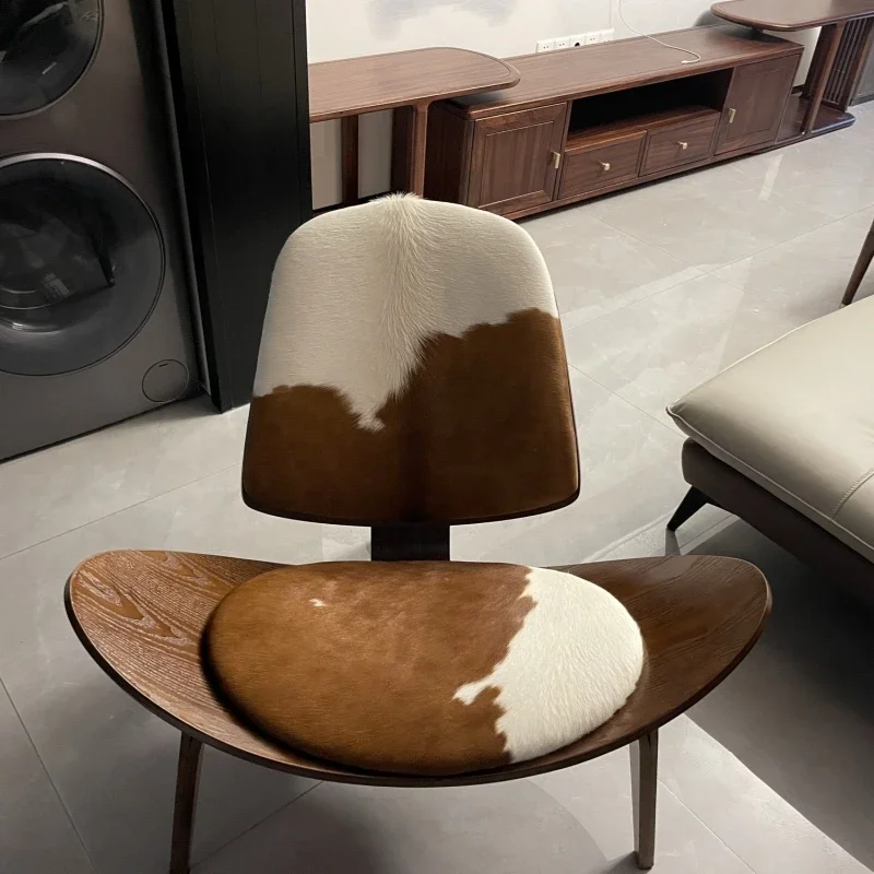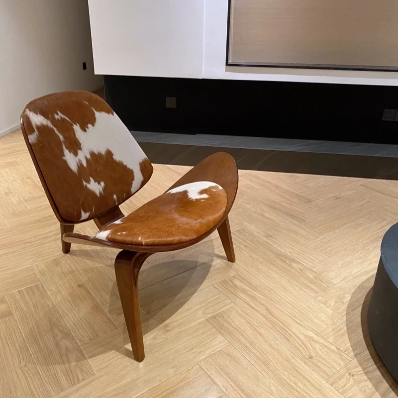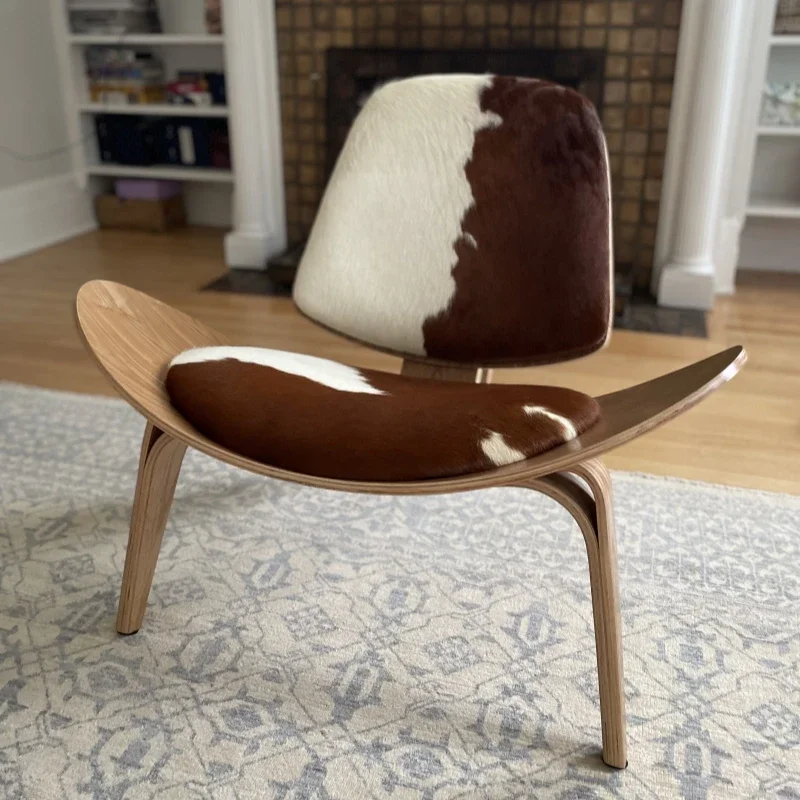 The Cowhide Chic Shell Lounge Chair epitomizes modern sophistication with its sleek shell design and luxurious cowhide upholstery, offering a stylish and comfortable seating option for contemporary interiors, combining natural elegance with sleek wooden legs for a chic statement piece that enhances any living space.