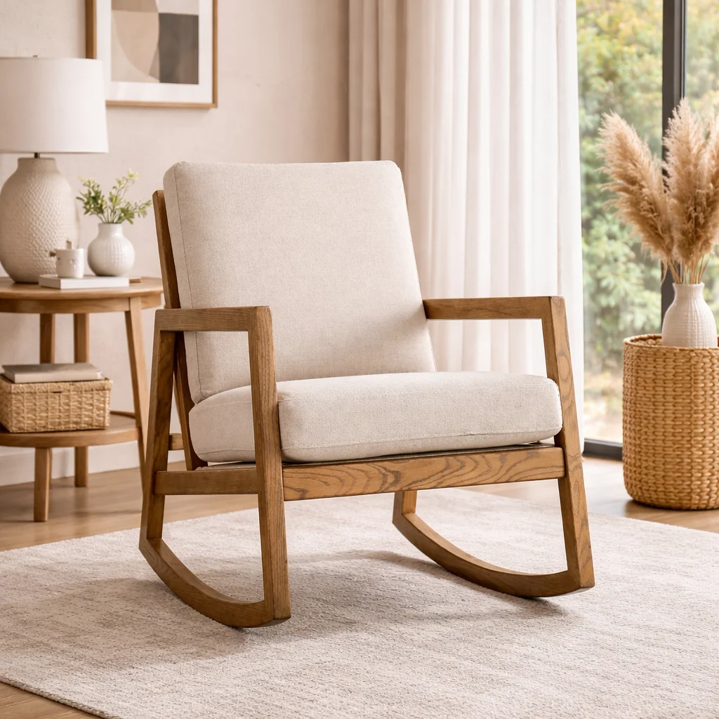The gently curved wooden base provides a smooth and calming rocking motion, while the integrated armrests enhance support and relaxation.